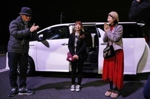 撮影を終えた監督と出演者のみなさん(右)高岡早紀さん (希望の丘広場)