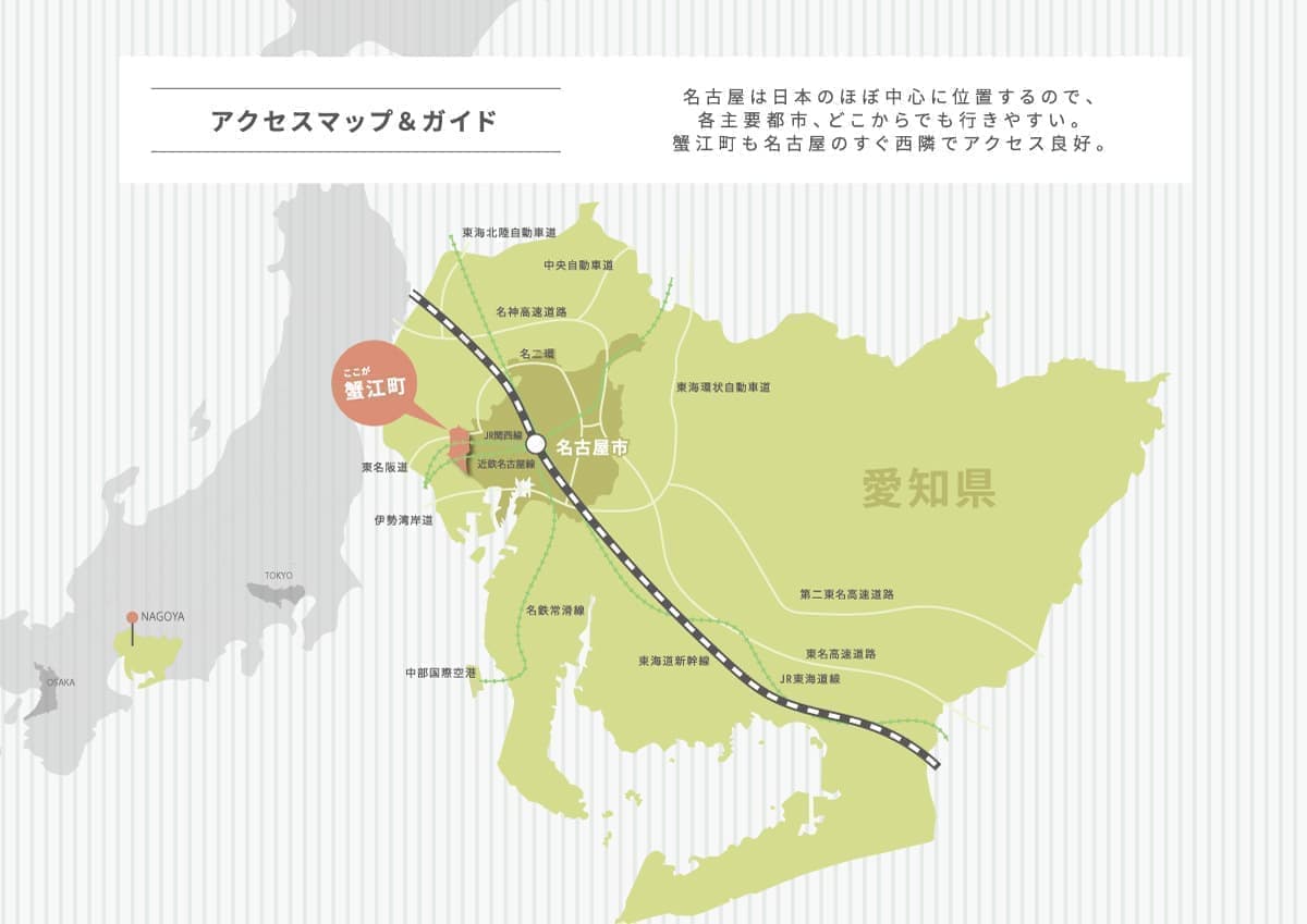 蟹江町は日本のほぼ中心に位置する愛知県において、名古屋市からわずか電車で10分、車でも20分という非常にアクセスに恵まれた町です。
